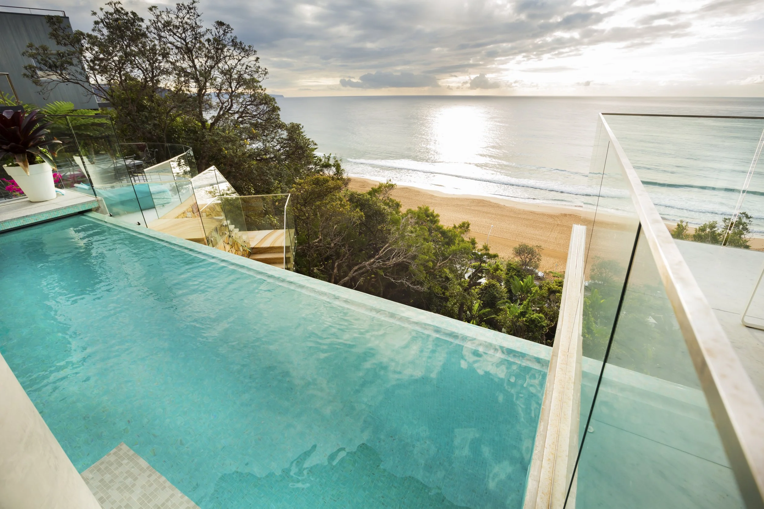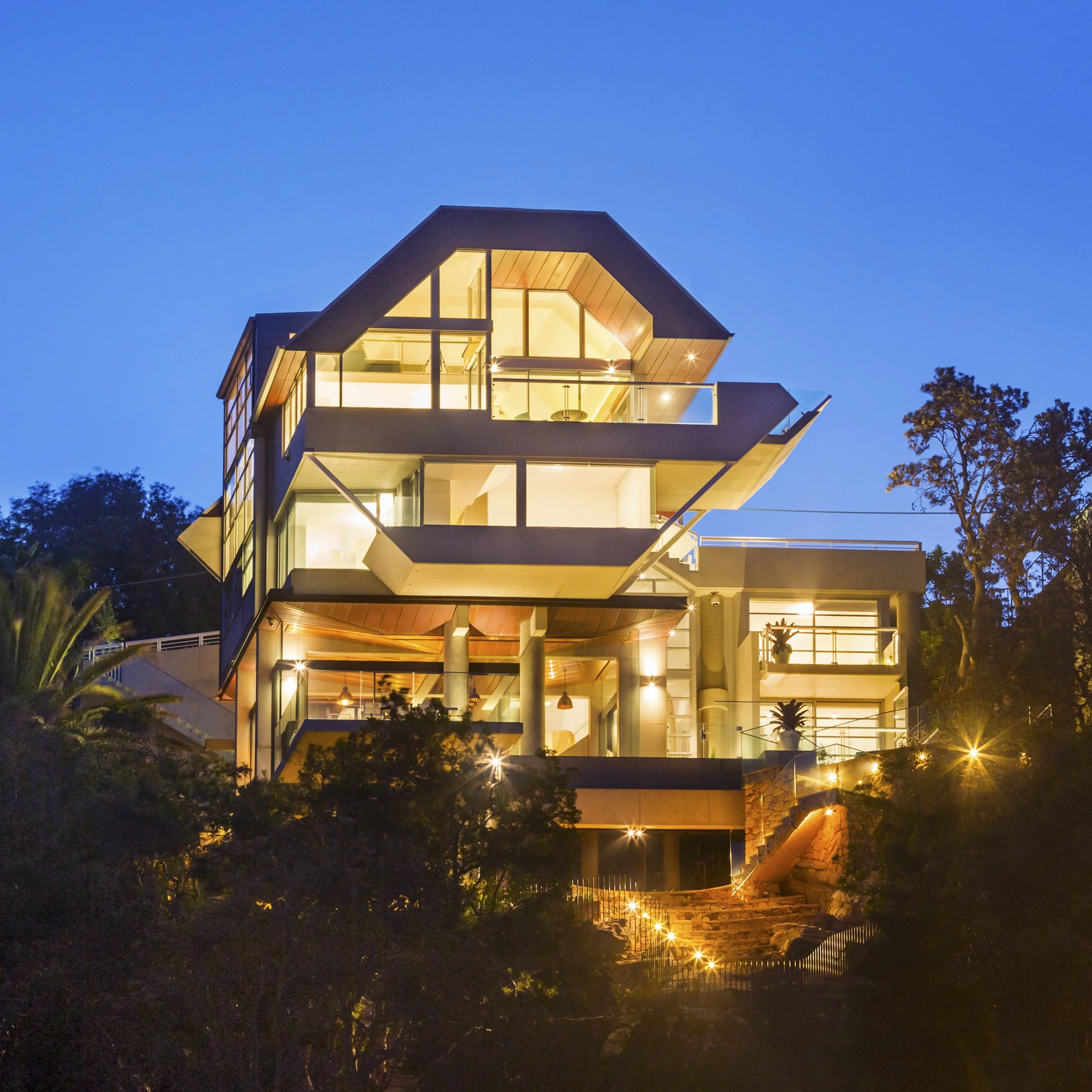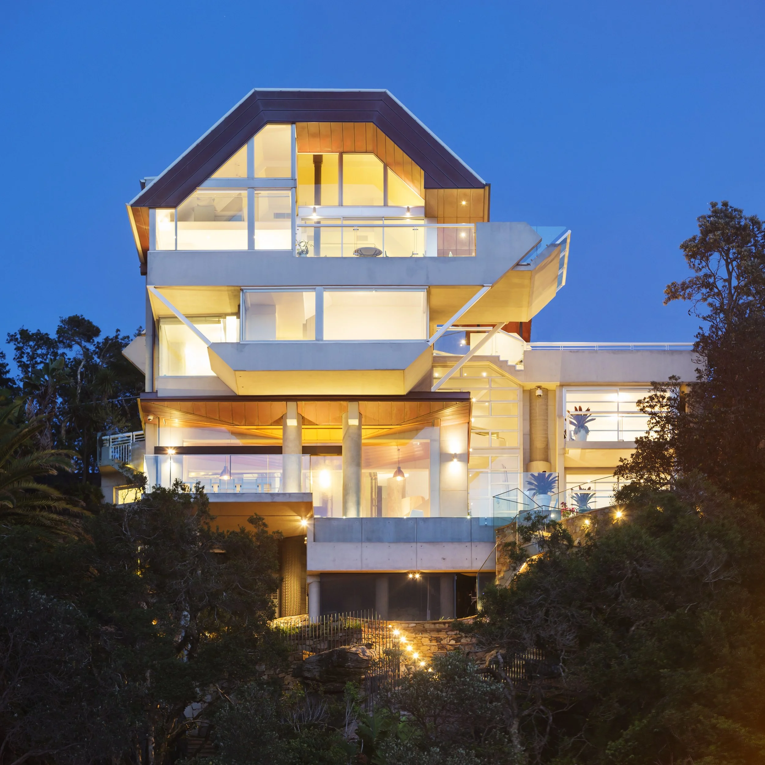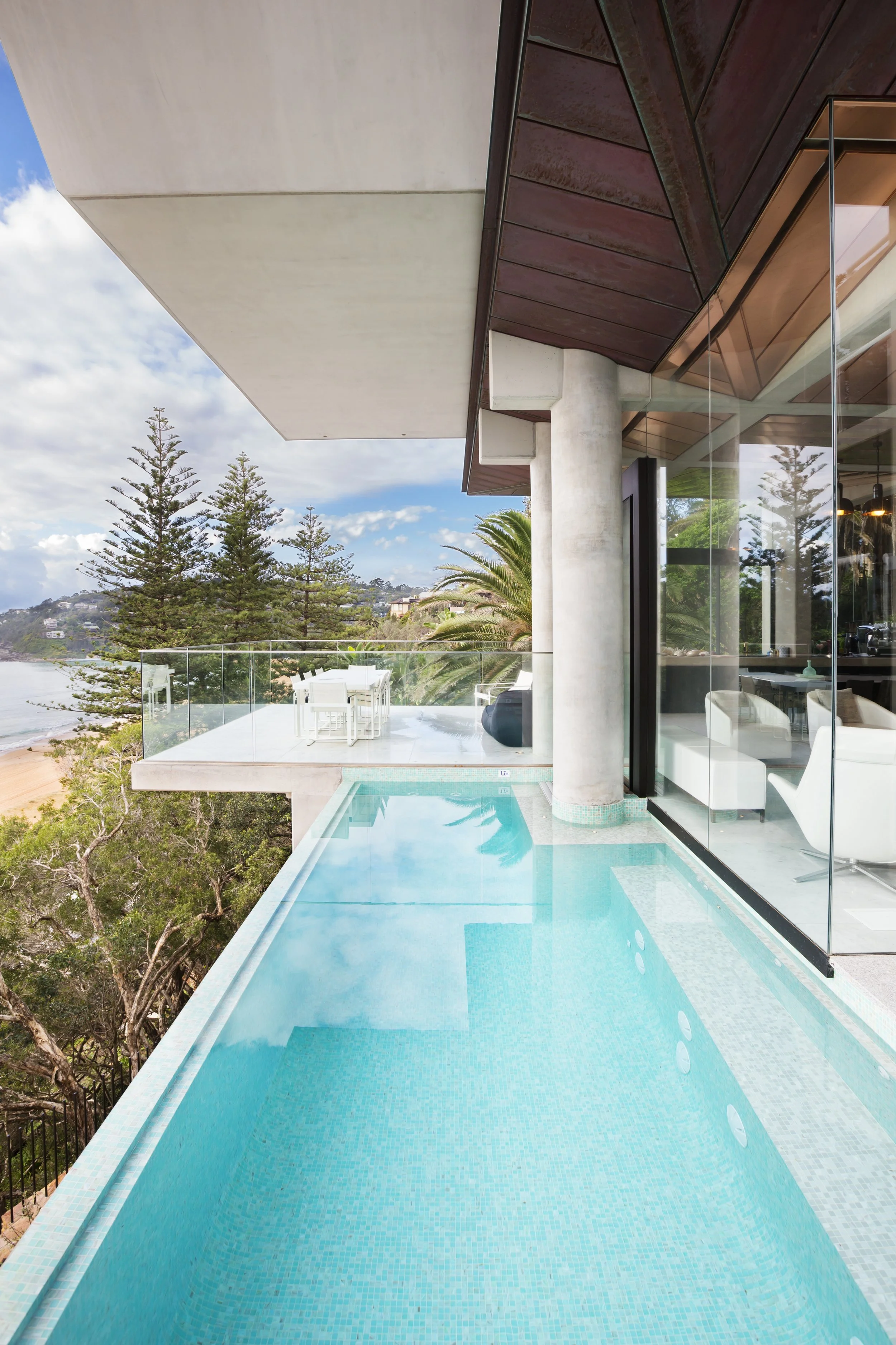 To create a harmonious connection between the warm copper cladding and the golden sand in the distance, sandstone is used exterior of the home creating moments of more subdued respite and calmness. The grandeur of Palm Beach House hides itself from the street as it nestles within the slope towering over Palm Beach and the headland below. Palm Beach House exemplifies how form and materiality can work together to create a bold and pronounced architectural statement.