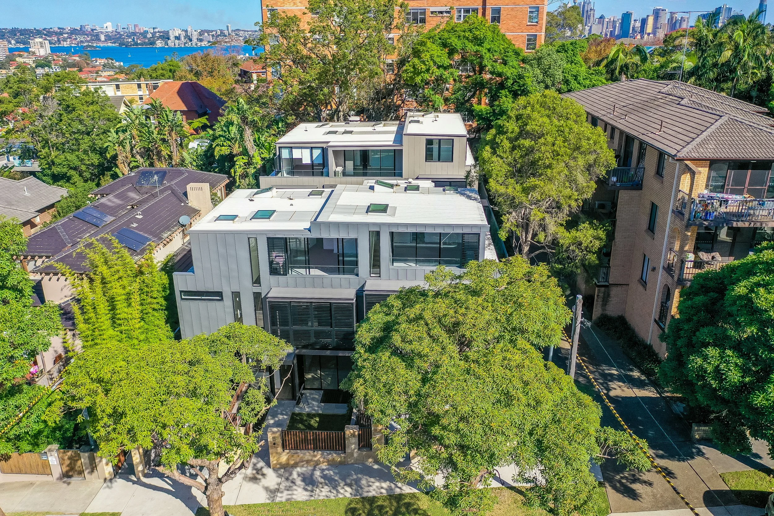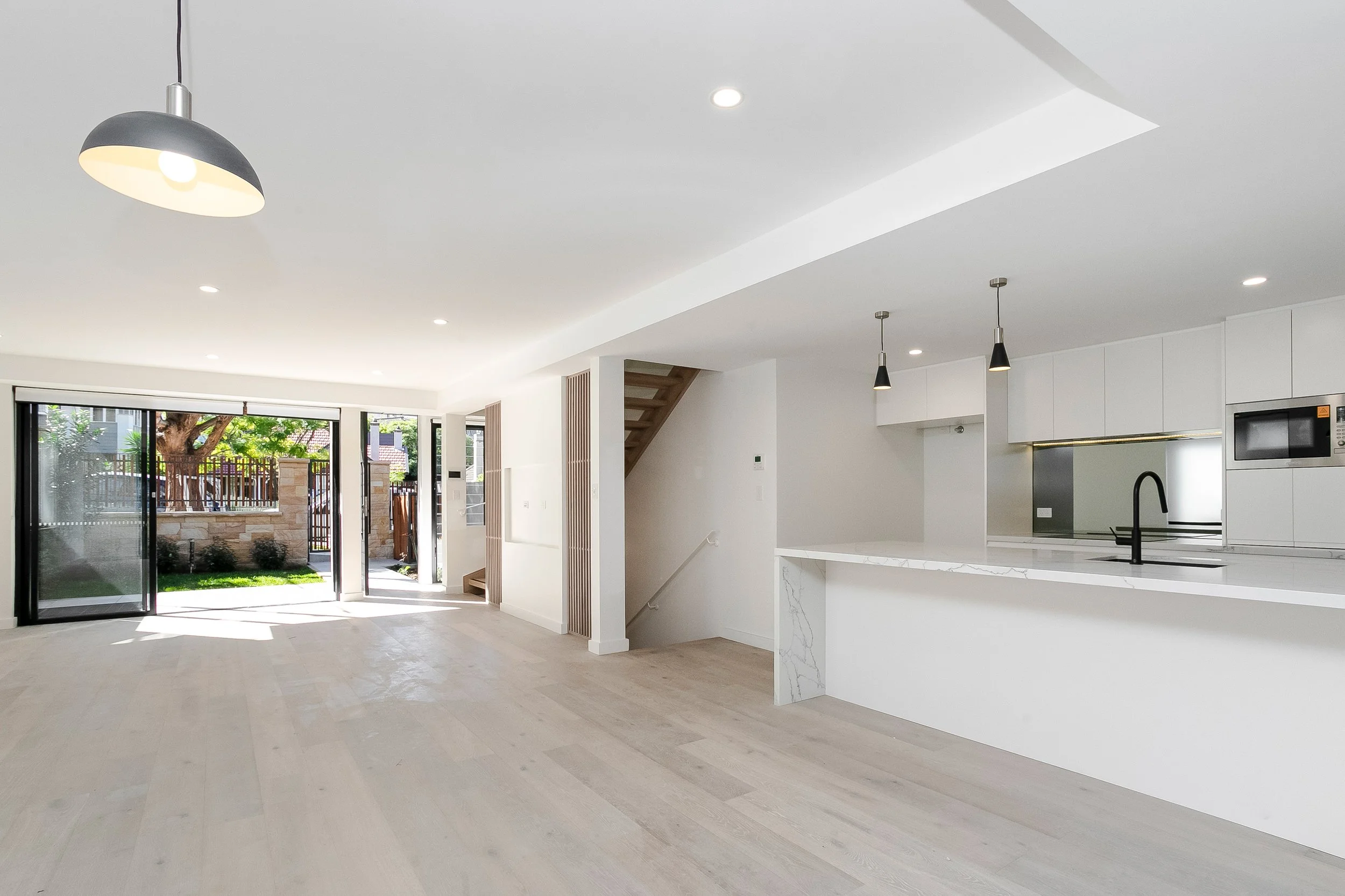 Internally, the design is characterized by light and precision. Open-plan living spaces flow across light-toned timber floors. The circulation spine, featuring a prominent floating timber staircase often screened by vertical timber battens, drawing natural light deep into the core of the dwelling. Finishes are highly contemporary and durable, ensuring a high-quality, streamlined living experience tailored for the modern urban resident.