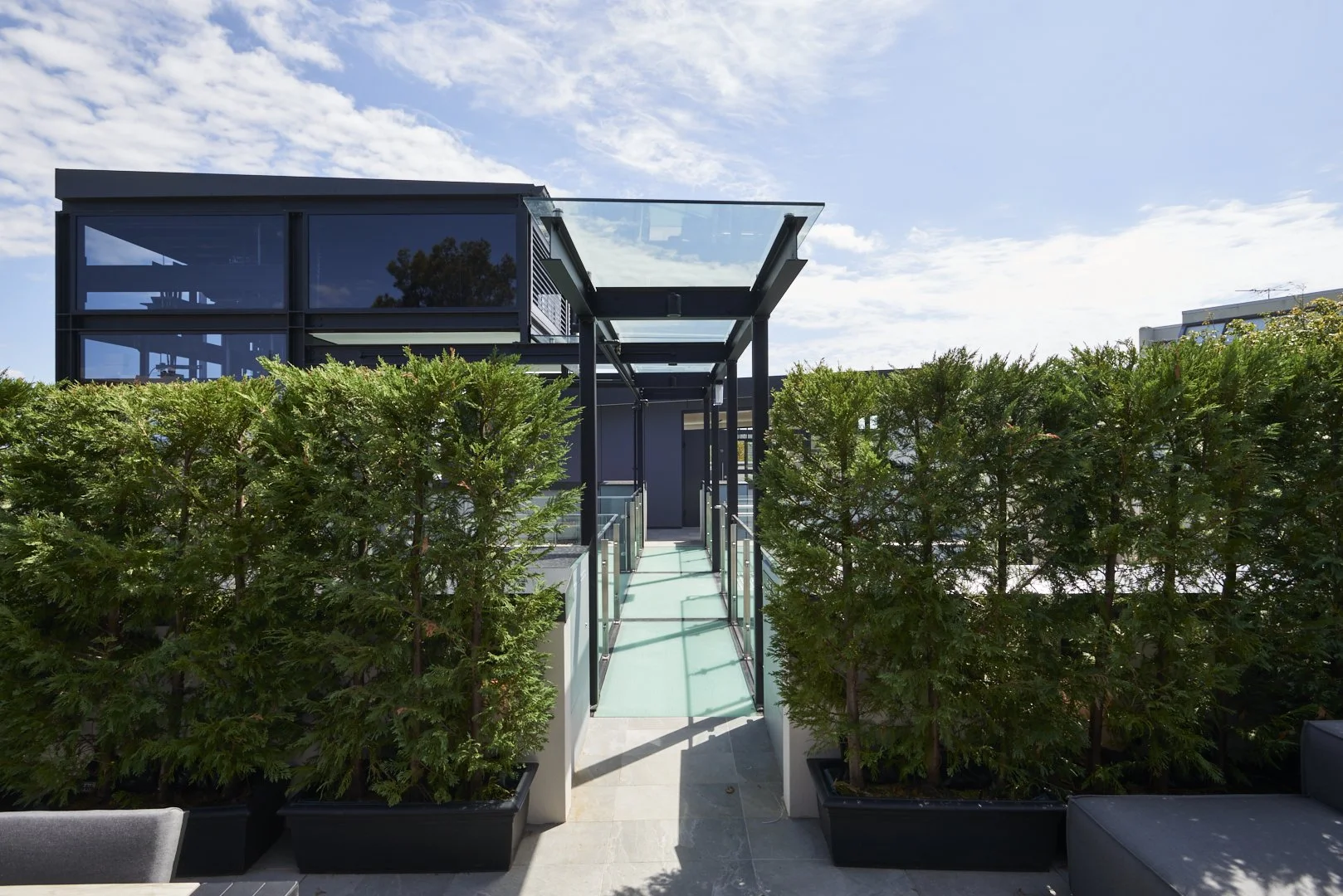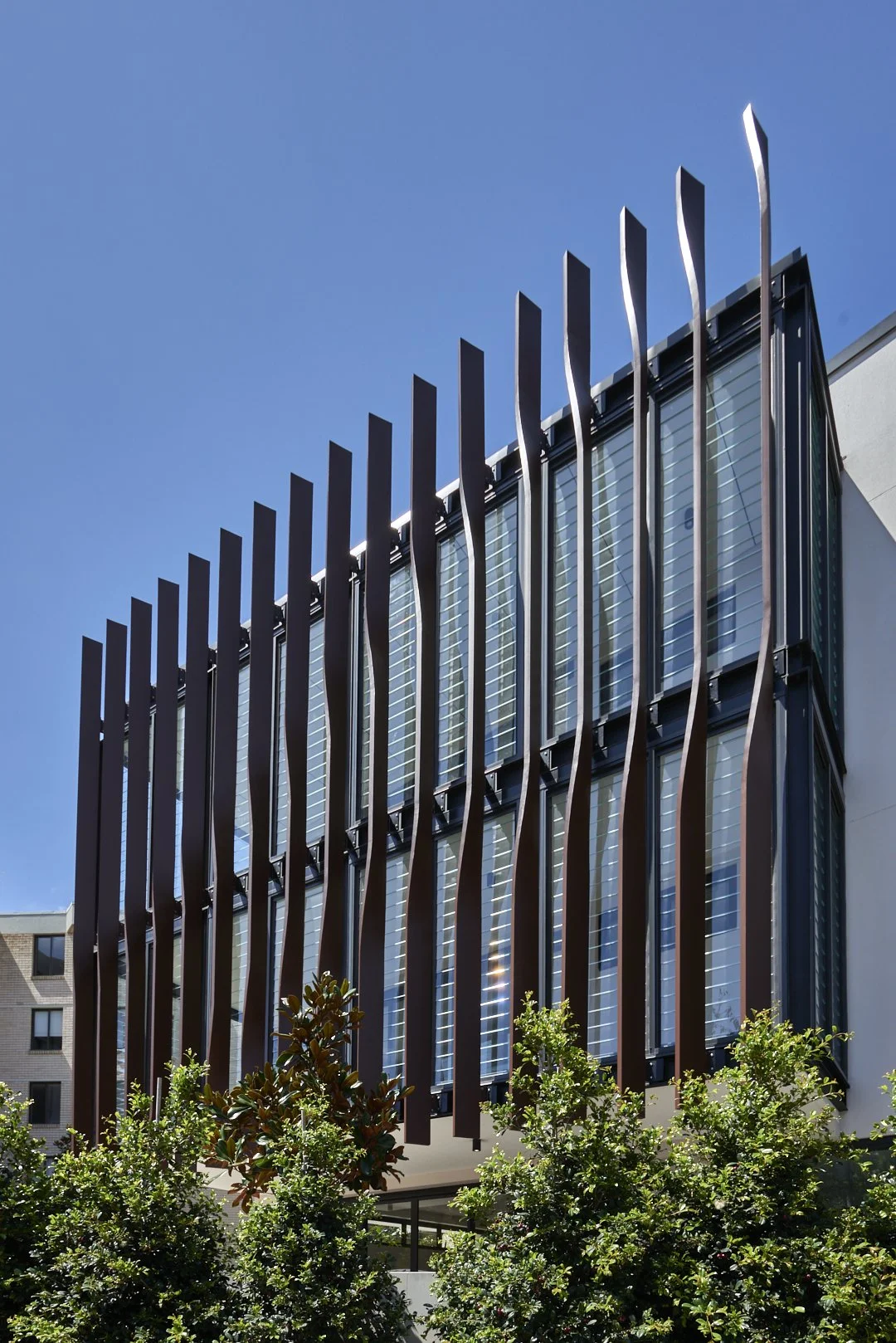 The building is characterised by its expressed curved fin façade that plays an active role in the buildings passive environmental performance. The fins are key to the buildings adherence to its northern aspect while also being an impressive feat in architectural expression and complex steelwork. The two pavilions are connected by a vertical glass lift the showers the building with natural light while serving as the circulation core to each unit. The lift is blanketed in vertical gardens to pull in the green leafy exterior of the building into each unit.