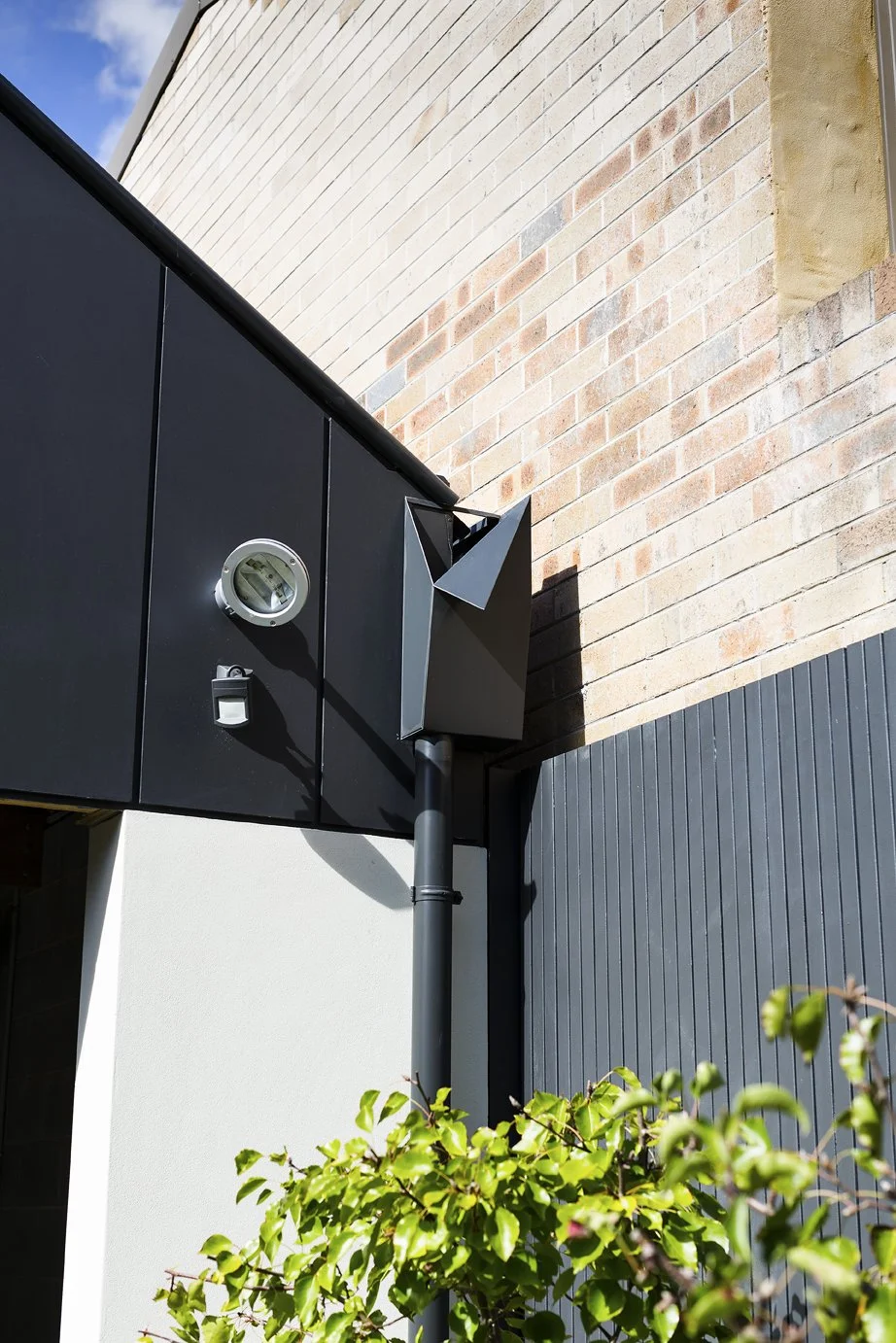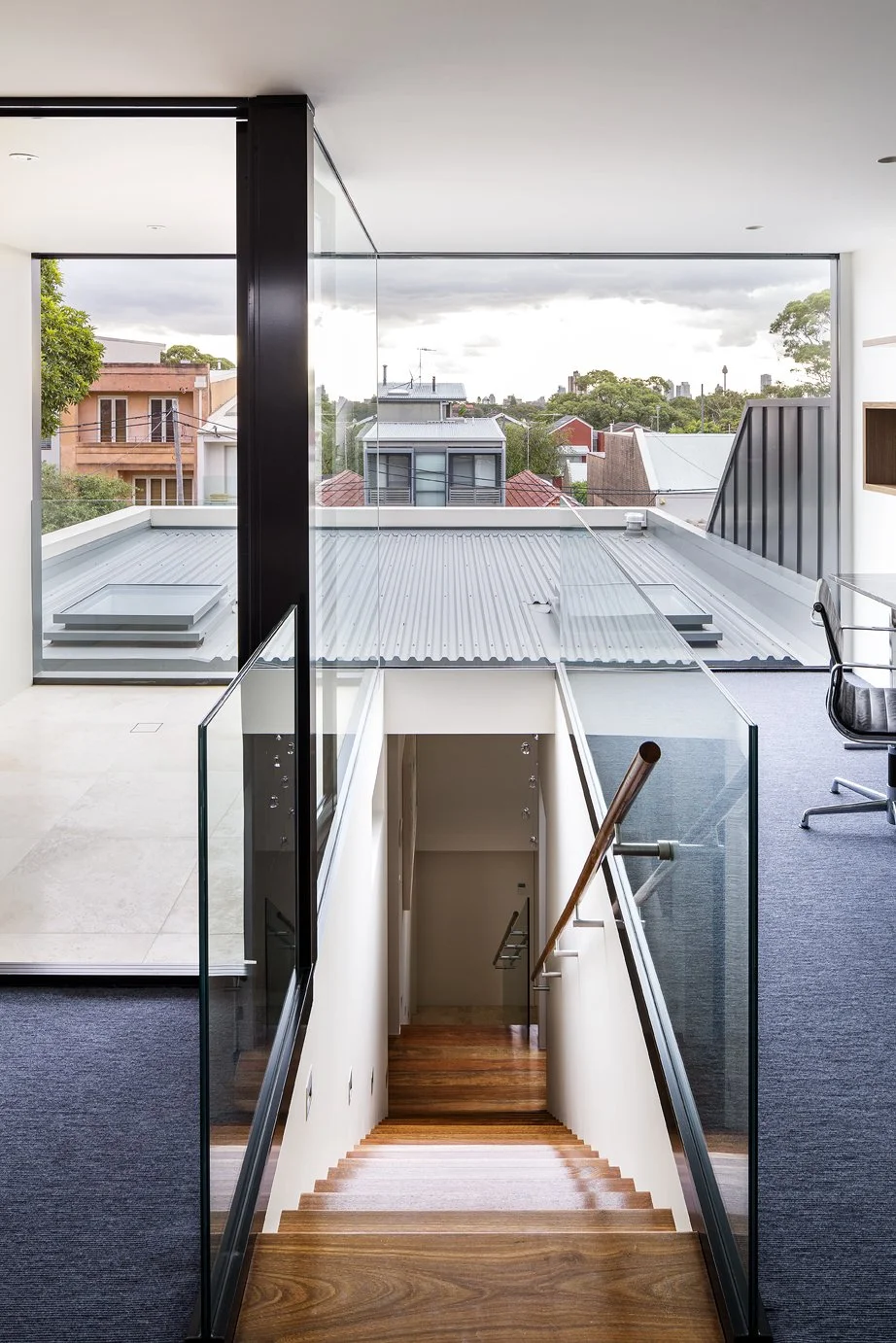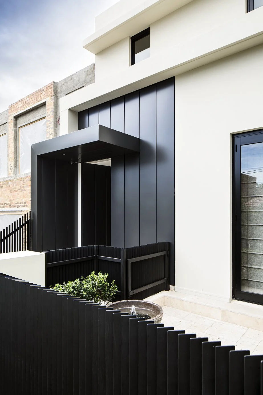 The Woollahra Row House is emblematic of a juxtaposition between light and dark and the effect that specific material applications have on the nature of a home. The Woollahra Row House is typified by its stark steal clad entryway. The striking use of engineered steal cladding covers the front door of the home with clean angular lines that enact the truthful capabilities of the material. The awning above the front door frames the homes entrance and is divisive of the strong vertical language of the cladding seems.