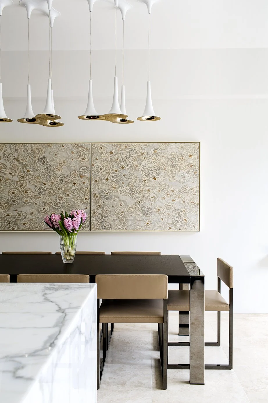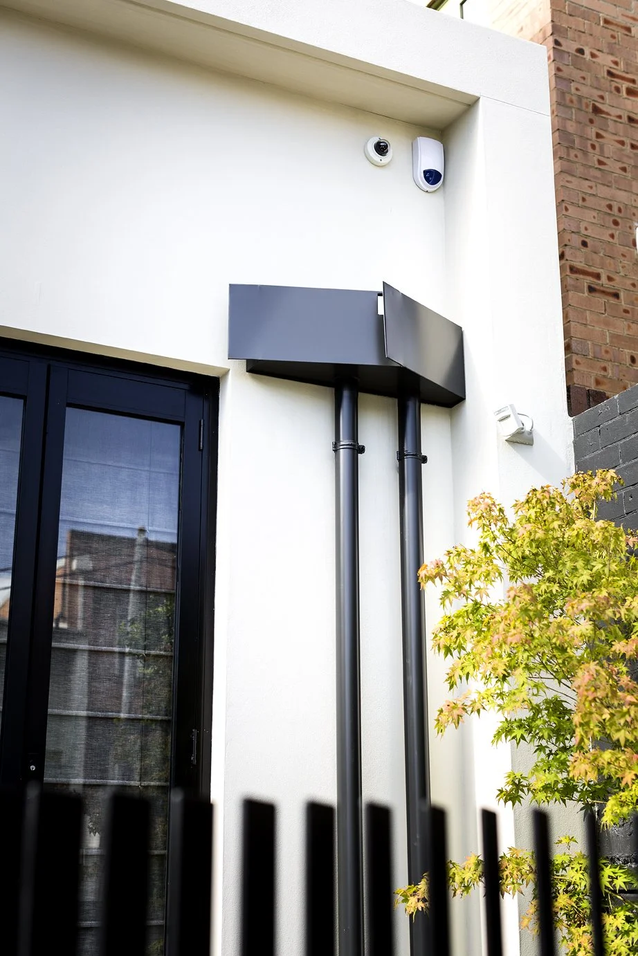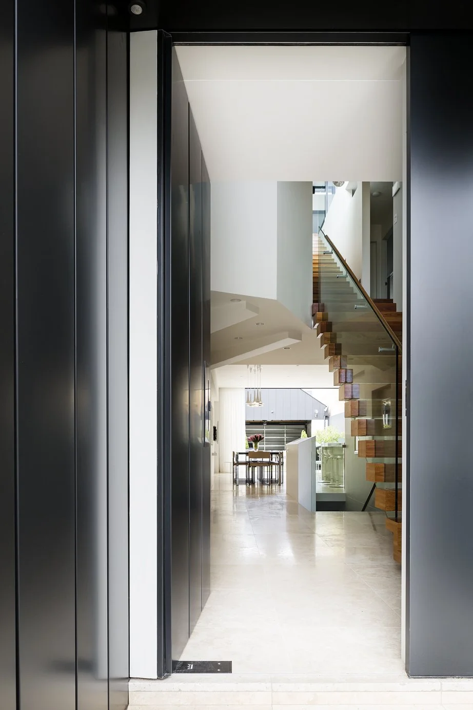 The Woollahra Row House is emblematic of a juxtaposition between light and dark and the effect that specific material applications have on the nature of a home. The Woollahra Row House is typified by its stark steal clad entryway. The striking use of engineered steal cladding covers the front door of the home with clean angular lines that enact the truthful capabilities of the material. The awning above the front door frames the homes entrance and is divisive of the strong vertical language of the cladding seems.