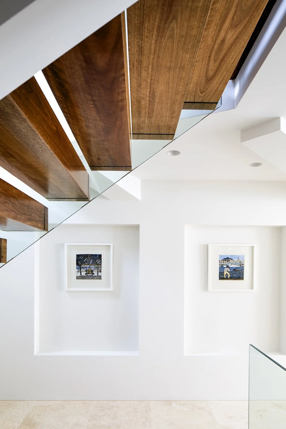 The homes interior palette is largely a maximisation of openness and light with a strong reliance on light timbers and reflective tile flooring. A vernacular that is consistent across all levels of the home with an elongated timber stair that ties together the upper and lower floors both physically and visually with the use of clear glass balustrades. The pointed and sharp language of the building’s exterior is seen throughout the interior of the home and extends itself again in playful architectural expressions like the custom rainwater head and window awnings. Woollahra Row House is modern at its every turn and has the widespread effect of luxury and individuality across the surrounding suburban landscape.