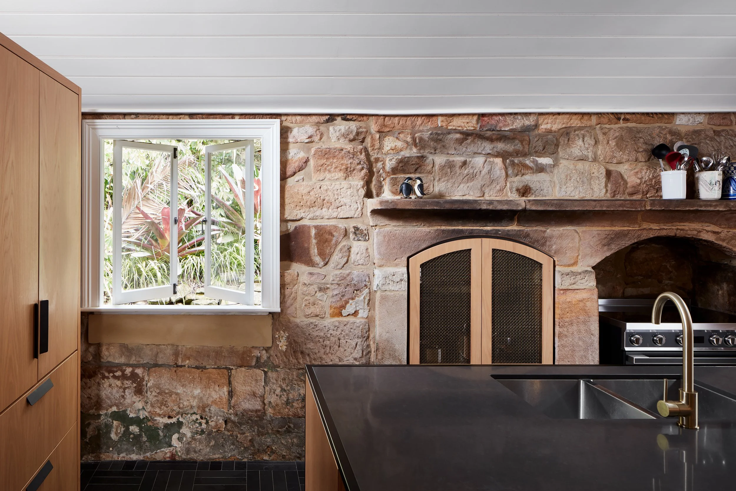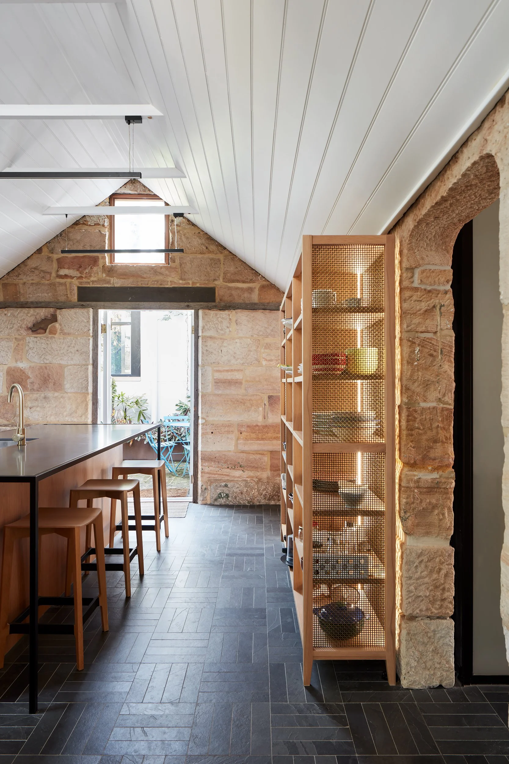 Inside, the home is a journey through layers of history. Lower levels celebrate the raw materiality of the stone, often using it as a dramatic backdrop for highly contemporary fittings, such as the minimalist kitchen island and the sleek bathroom vanities set against herringbone slate floors and white mosaic tiles. Circulation is unified by a sculptural, light timber staircase which elegantly bridges the old with the new modern upper floor. This juxtaposition results in a home that not only honors its past but creates a bespoke, luxurious pairing where natural light and historic texture coexist in perfect equilibrium.