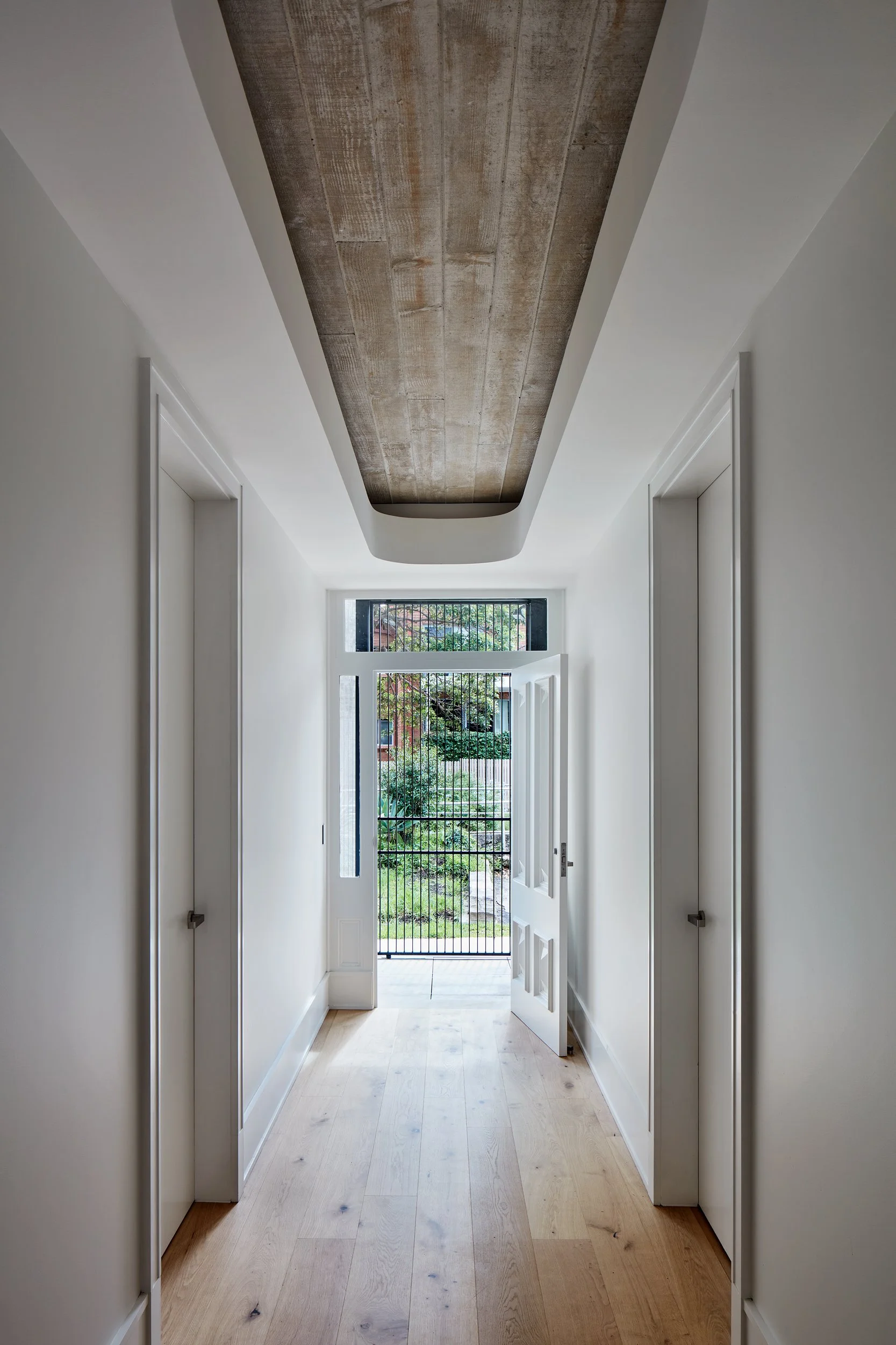 The street façade introduces a critical design element: a continuous skin of expanded metal mesh. This screen provides solar mitigation and visual privacy while allowing diffused light and ventilation, offering a contemporary veil over the traditional scale of the underlying structure. The exposed elements—raw cement render, deep black steel frames, and light zinc roofing—speak to a refined industrial aesthetic.
