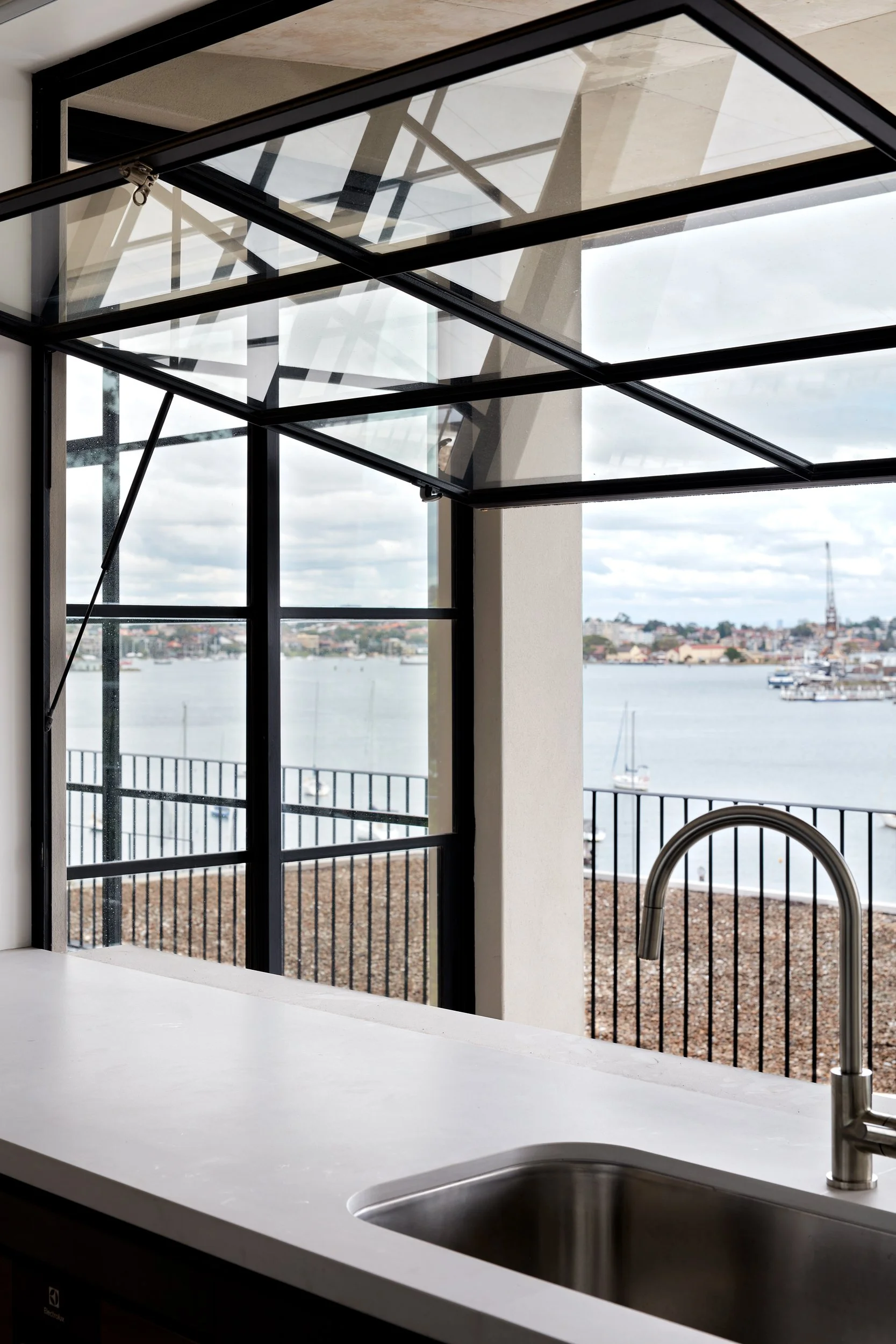 Internally, the concept of contrast and craftsmanship prevails. Steel-framed picture windowsand doors, reminiscent of industrial glazing, anchor the living spaces, framing panoramic water views like artwork. Circulation is highlighted by a bold, sculptural black staircase, its monolithic form serving as the geometric spine of the building. This drama is softened by a palette of subtle luxury: warm light-stained timber floors and built-in joinery, contrasting with the textural depth of small, reflective white mosaic tiling and feature ceilings that expose off-form concrete, often framed by subtle, illuminated recesses, ensuring that every detail contributes to a cohesive experience of refined modern living.