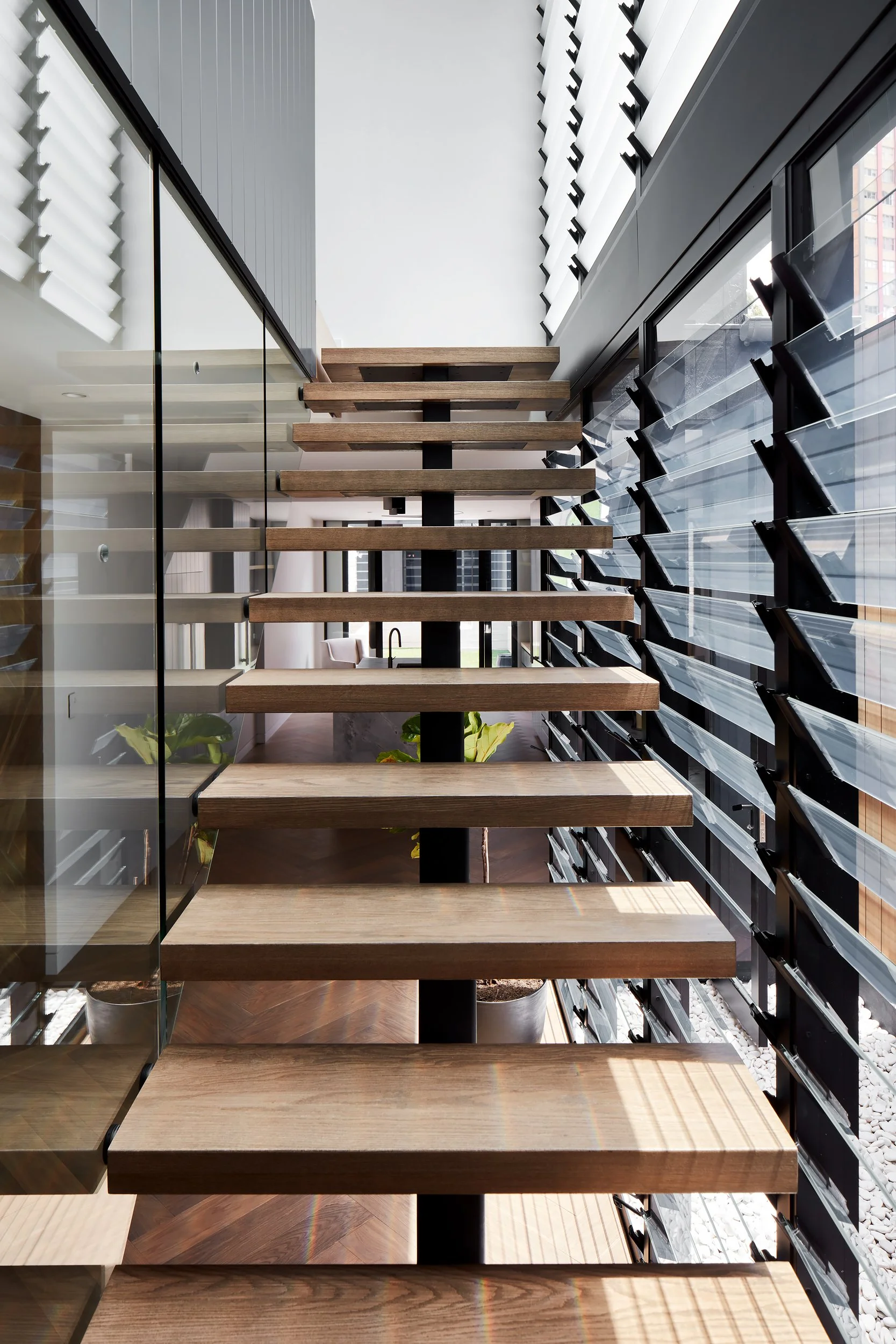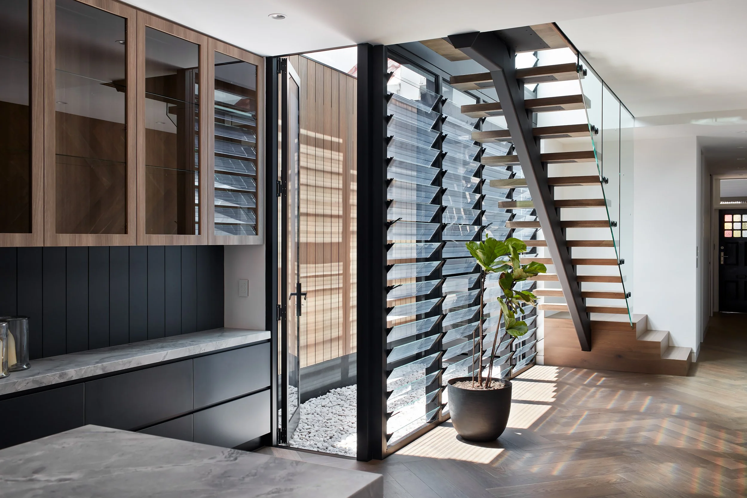 The interior is defined by a central double-height void and suspended timber staircase. Featuring floating treads anchored by a minimal steel stringer and bounded by glass balustrades, this sculptural element is flooded with modulated natural light from the adjacent louvres, becoming the heart of the home. Throughout the dwelling, warm herringbone timber flooring and subtle, earthy materials like marble and textured grey stone contrast with the striking black joinery and clean white walls, creating a powerful yet serene environment that is both architecturally rigorous and luxuriously appointed.