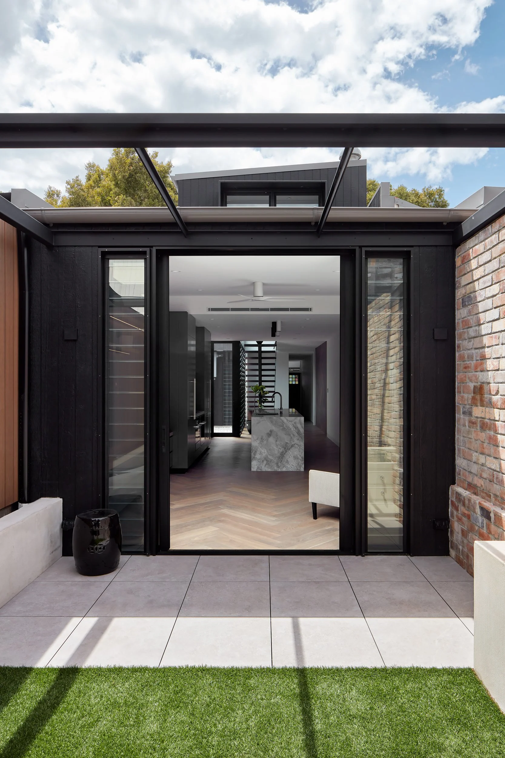 The exterior presents a bold, monochromatic aesthetic: the new rear volumes clad in dark, vertical paneling, creating a striking contrast with the neighboring properties. The addition is recessed and carefully fenestrated, using large format operable louvre windows and glazed internal facades to control light and ventilation while maintaining discreet visual separation from the adjacent properties.